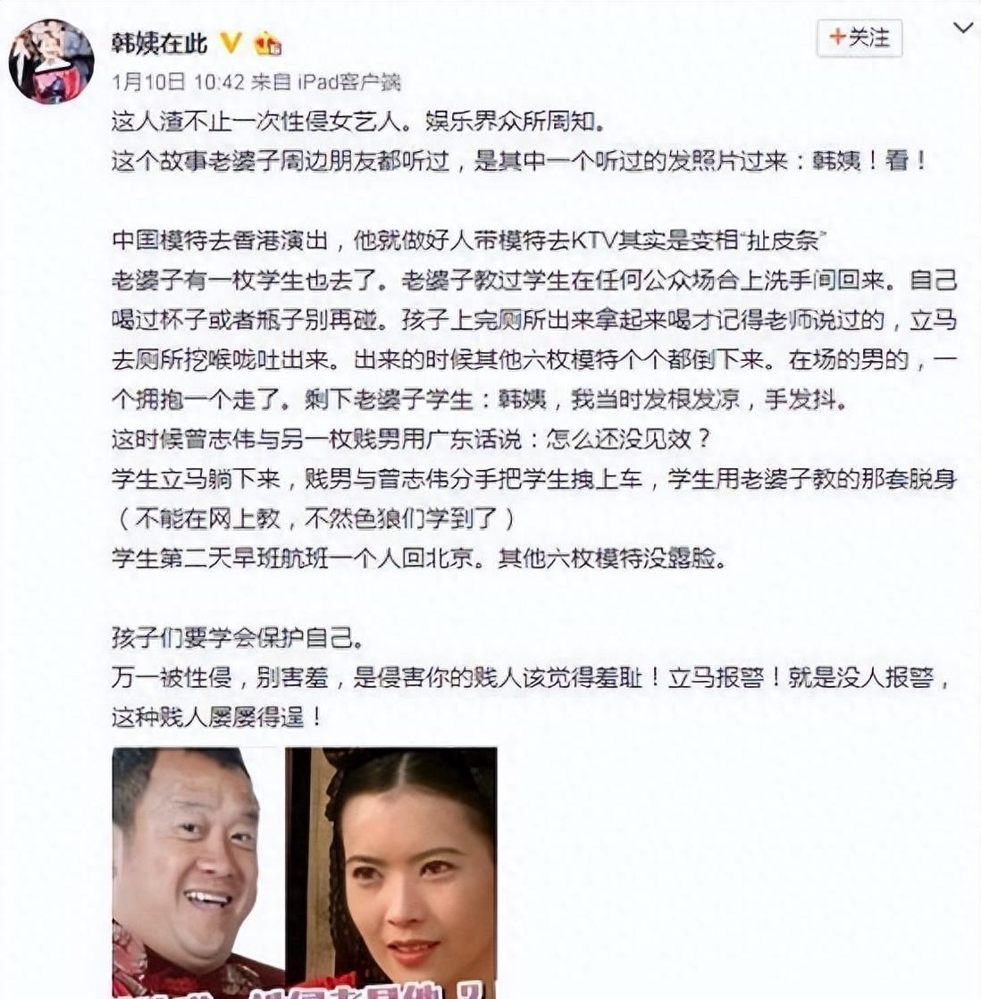 【一】韩颖华曝光曾志伟性骚扰事件在网络上,有一位名叫韩颖华的女性勇敢地爆料,曾志伟利用职务之便,对6名女模进行性骚扰。其中,韩颖华公司旗下的艺人也不幸成为了受害者之一。韩颖华之前带着艺人去香港参加活动,没想到收到了曾志伟的盛情邀请,结果却发现几名女孩被迷晕。