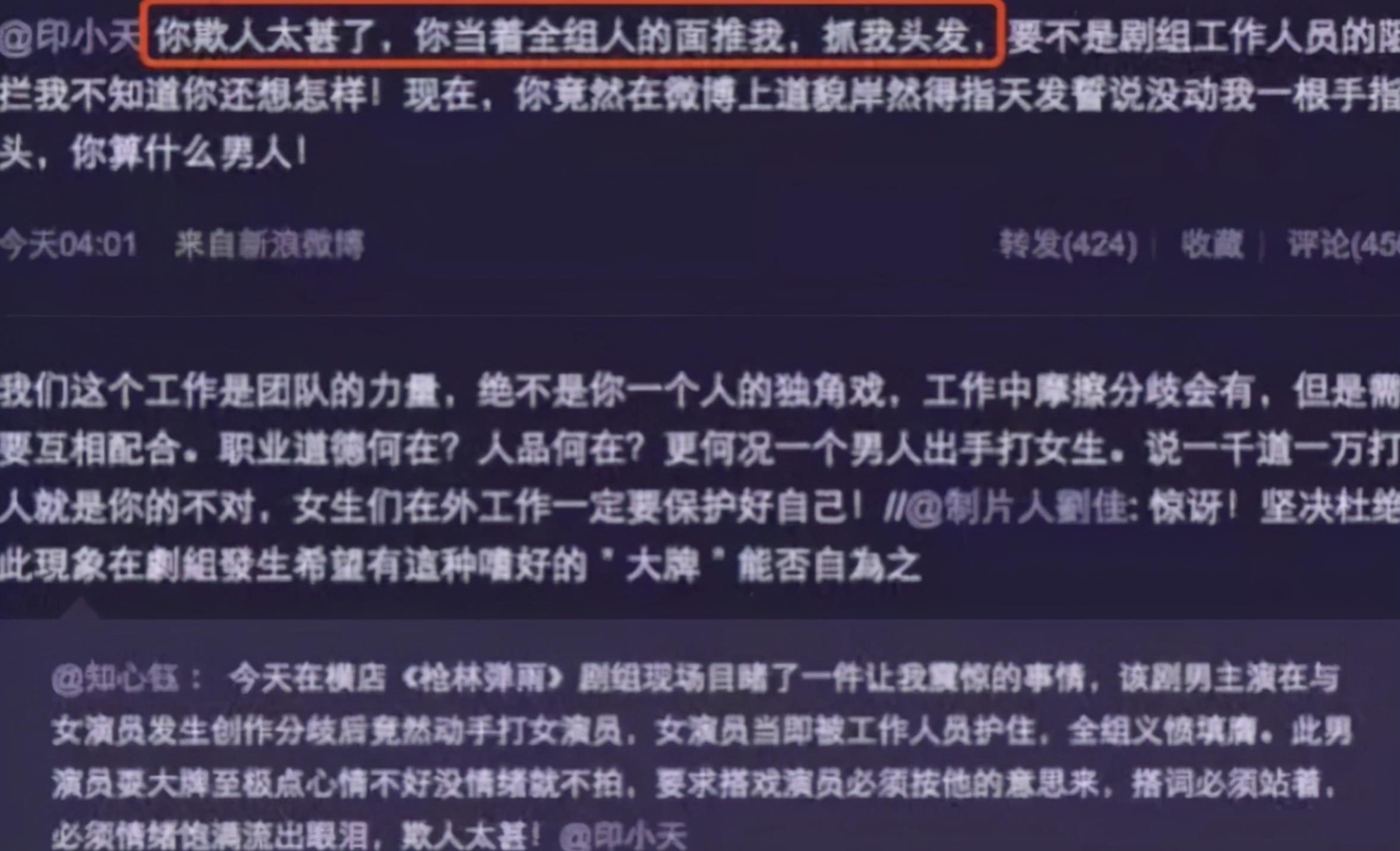 她通过网络向大家控诉印小天的种种不是,比如公然在剧组对她动手,推她、拽她头发等。