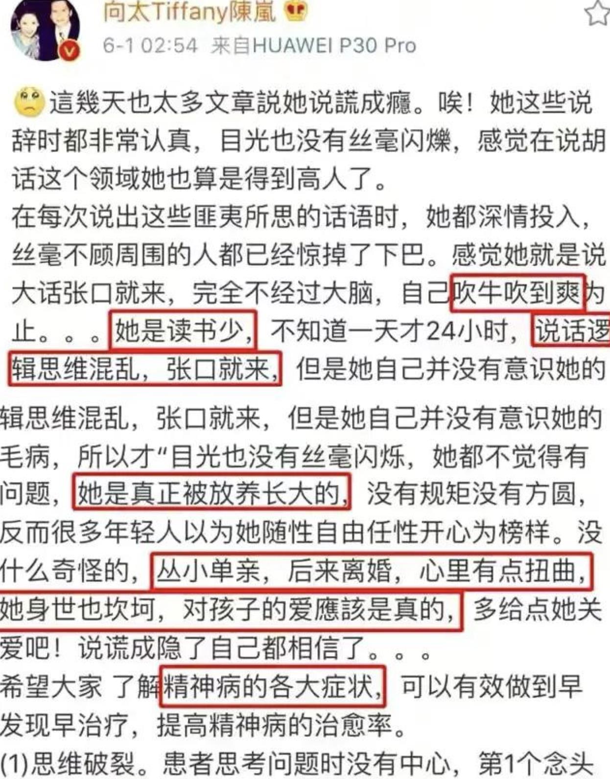 她说张柏芝读书少,思维混乱,被放养长大,心理扭曲,甚至还含沙射影说张柏芝有精神病的症状,颇有杀人诛心之势。