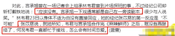 或许是两人的绯闻闹得太大,就在此时言承旭的经纪人突然站出来表示:“言承旭应该没有谈恋爱,每次一下戏他就会在一旁读剧本。”