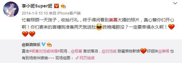 之后李小璐和杨幂相继结婚,也都只是发了条微博“聊表心意”,不过李小璐更绝,她祝福杨幂新婚的微博,是在婚礼第二天转发新浪娱乐的,敷衍的简直让人呵呵。