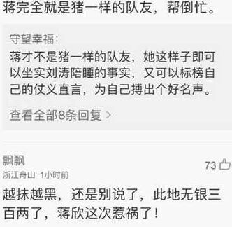 这一看起来十分仗义的发言,却无形中让刘涛坐实了“陪睡、打野战”的传闻,而蒋欣本人也被网友封为了“猪队友”: