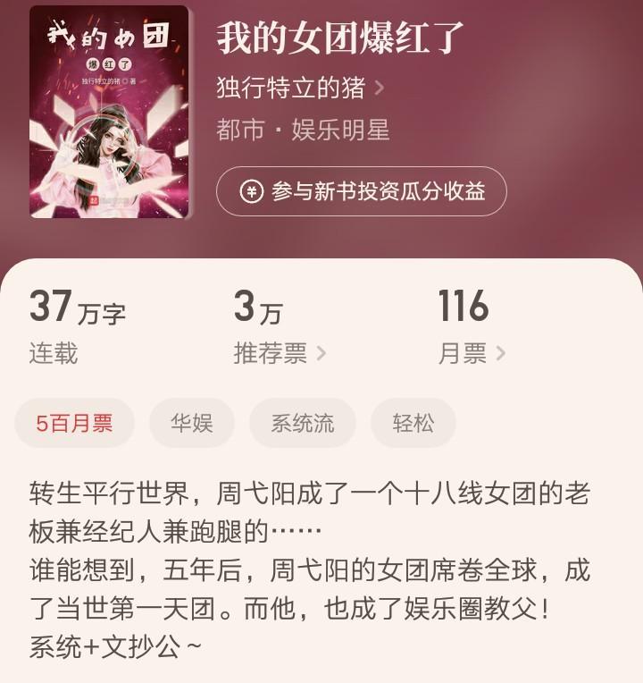 一个萌新作者的作品,讲述了男主周弋阳率领他的四人女团闯荡娱乐圈的故事。开头四人的开场白,令人大笑。特长是说唱的汪星蕊却擅长唱歌,唐玥不会跳舞反而更会太极拳,还有一位什么都不会的门面担当。真的是非常奇葩了。小说偏系统流加文抄公,故事剧情轻松搞笑,属于一本不错的华娱类文娱文。
