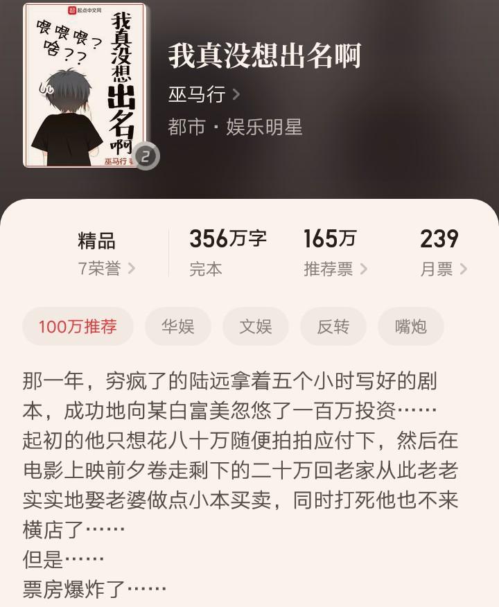 特别搞笑的一本文娱爽文,讲述了主角写五个小时剧本,忽悠白富美,花80万拍戏,票房却意外火爆。拌嘴、反转,轻松搞笑。刚完结不久,名气却不减。