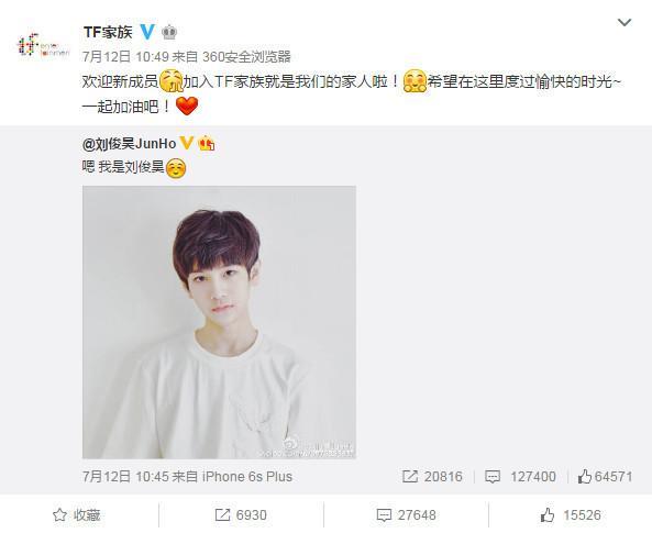 TF家族官博突然宣告新人加入,新人刘俊昊微博没有家族前缀,不是练习生,没有任何介绍;