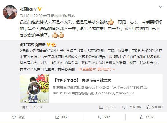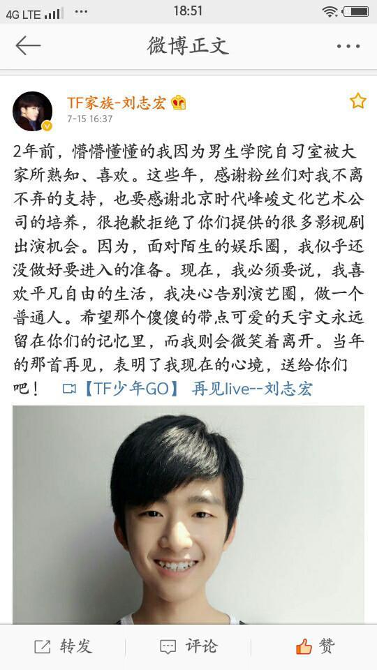 7月15日,TF家族刘志宏发微博宣布离开演艺圈。此前,已经有2个月多没有发微博,有人认为是跟公司重视不足,新人刘什么昊空降过来有关。