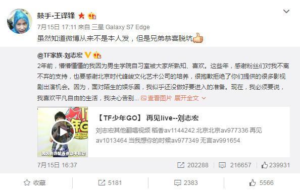 前TF家族成员张啸,王译锋纷纷发博,两人转评内容几乎一模一样,均指责公司代发微博并恭喜刘志宏脱离火坑