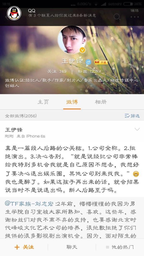 和TF家族合作过的艺人王伊锋发了一条微博如下:真是一篇断人后路的公关稿,1、公司全称2、拒绝演出3、决心告别。“就是说经纪公司非常棒给我特别多的机会我就是自己原因不想去我想好了要决心退出娱乐圈其他公司别来找我”我也是醉了。如果这孩子再出来的话,就会招黑说当时不是说退出吗。断人后路至于吗。