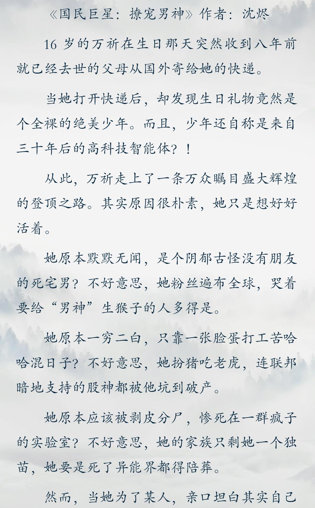 简评:这是我正在追的小说,女主苏云舒,利用前世的娱乐圈知识库,和在系统中抽取的技能卡,在娱乐圈中步步高升。女主金手指很大,好像什么都会,看下去会很爽。里面出现了很多现在的小说和歌曲,这也是我爱看这类小说的原因之一,一边听歌一边看小说,有一种身临其境的感觉。至于男主,我比较喜欢他一开始出场的形象,和女主在一起后就像变了一个人,反差太大有点别扭。我要吐槽的一点是,女主已经搬运了那么多经典的小说和音乐,在小说,音乐,游戏方面都有一定成就,也表现了很多才艺,按理应该一炮而红的,怎么感觉人气上升不明显呢。