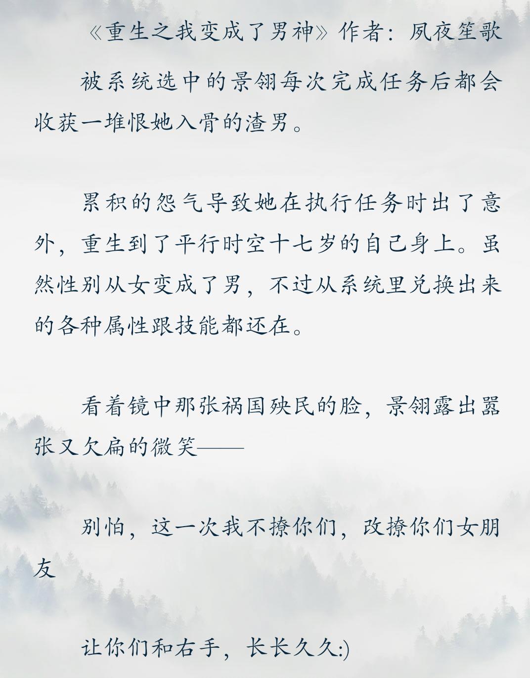 简评:我犹豫过要不要把这本书放在这里,想想还是放了,这本不是女扮男装,而是女穿男,直接变成了男人。主角本来绑定了系统,穿梭在不同世界帮助女主成就事业,最后阴沟里翻船穿越平行时空,走上明星之路。单这样看还是不错的,但是!这本书是有女主的,女主是主角在这个平行时空的另一个自己,这个就刺激了,相当于自己和自己谈恋爱,这不是自攻自受吗,反正我一开始别扭了好久,能接受这个设定的可以试一试。