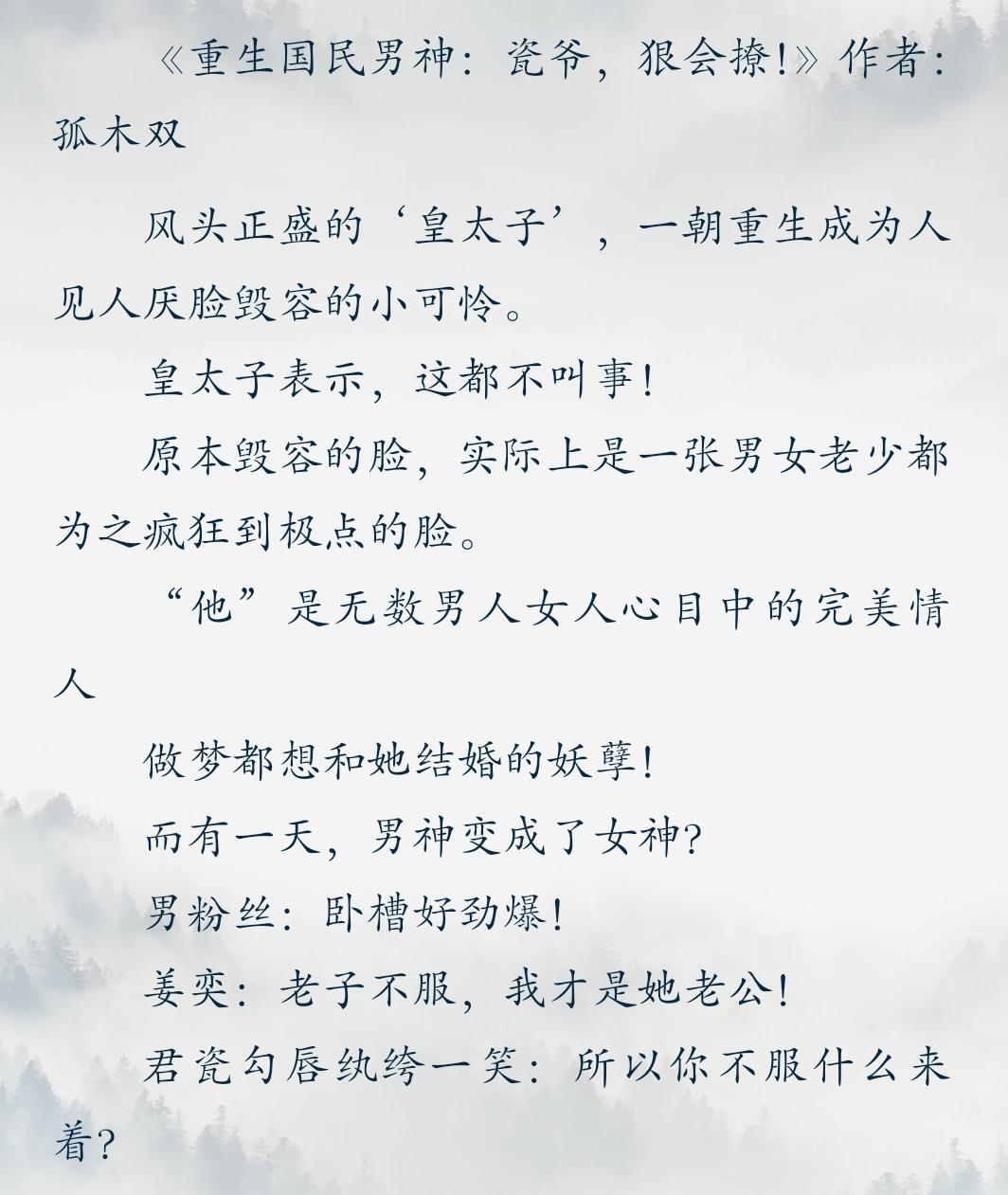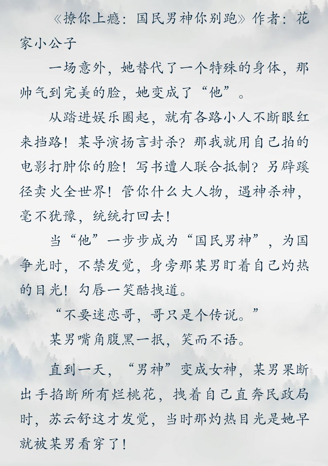 简评:女主君瓷,星际时代皇太子,从小女扮男装,篡位失败后重生到了地球女生身上。治好脸上的痕迹,寻找亲生父母,进入娱乐圈当导演,一步步走上人生巅峰。男主姜奕,京都太子爷,刚出场就被女主揍了一顿,与女主不打不相识并逐渐产生感情,一开始不知道女主是女生,还以为自己是个断袖,好在没有纠结多久。此文女主虽然混娱乐圈,但是不当演员而是导演,最大的金手指来自光脑,拥有超时代的技术,女主拍电影时的特效都是由光脑制造的。另外,女主公开身份比较晚,一直是国民男神,我就喜欢这样的剧情,看个小说跟追星一样。