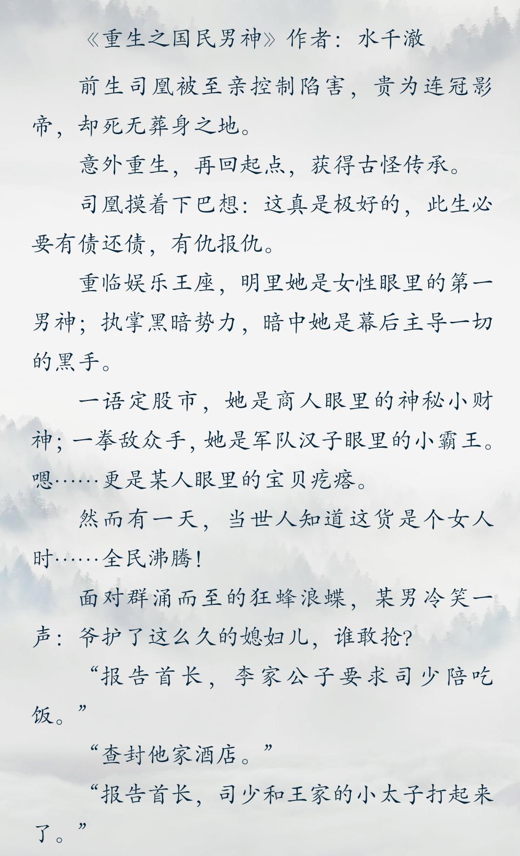 简评:这本书可谓是红极一时了,水千澈的文质量是有保证的,女主当得起国民男神的称号,一路虐渣打脸收人气。这本书加入了异能元素,整本书的格局大了不少。相对于作者其它书而言,配角出彩了不少,不像其它书一样,没有男配是男主的一回之敌,但是这也有麻烦,比起男主,我更喜欢冰山男配呀,想到他以后孤零零的就看不下去了。开玩笑的,这本书超级好看,超级推荐,没看过的可以去看一下,不会令你失望的。