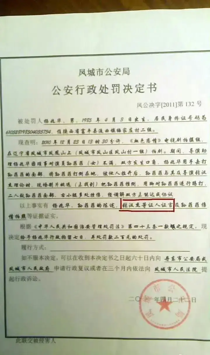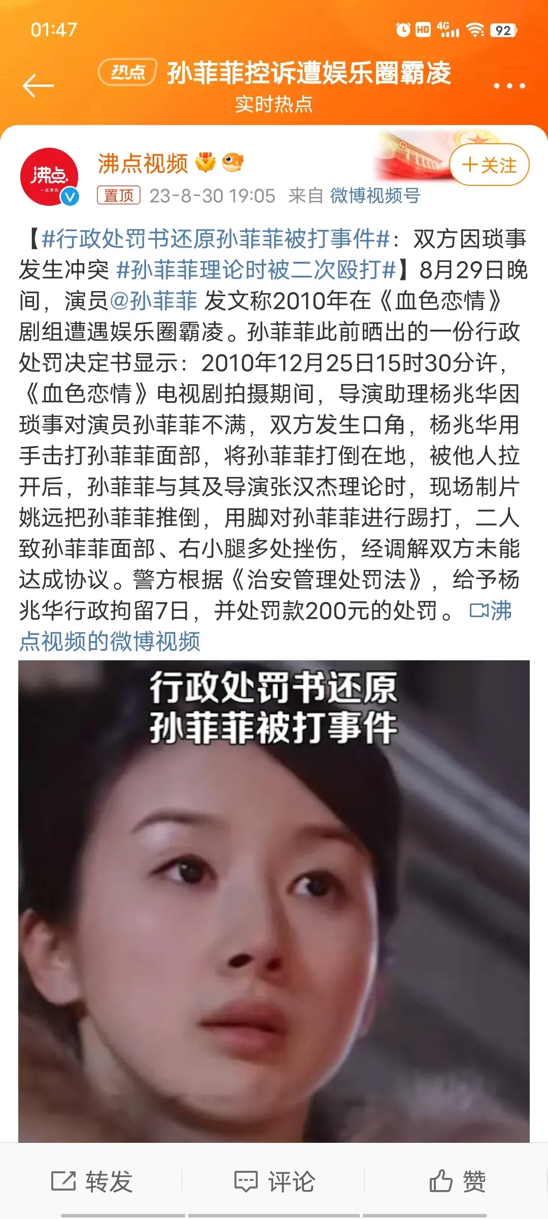 有网友发现孙菲菲曾经发布过一份行政处罚决定书。证明娱乐圈霸凌、殴打事件是真实发生过。