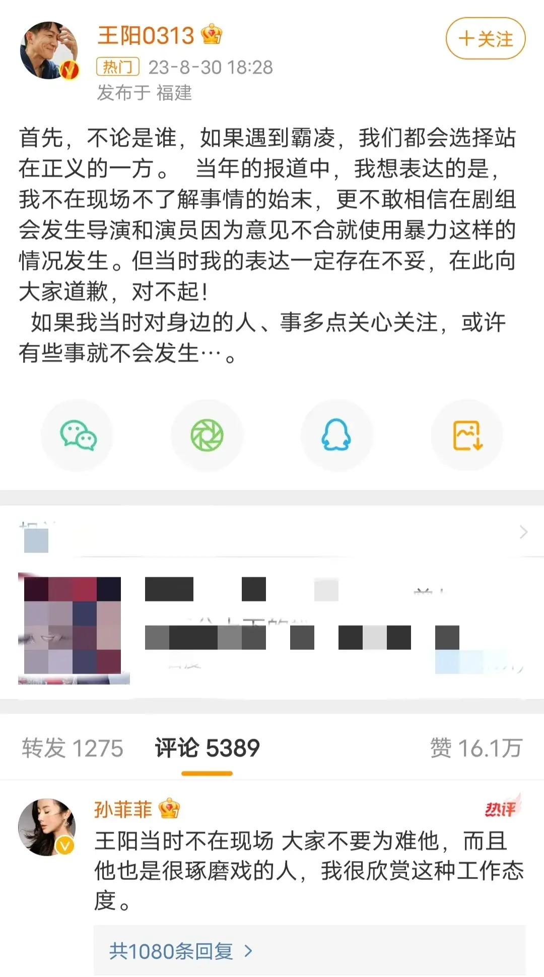 孙菲菲随后也在王阳微博下面评论说:“王阳当时不在现场 大家不要为难他,而且他也是很琢磨戏的人,我很欣赏这种工作态度。”说明王阳的确不知情,孙菲菲不想因为这件事牵连王阳被网爆。