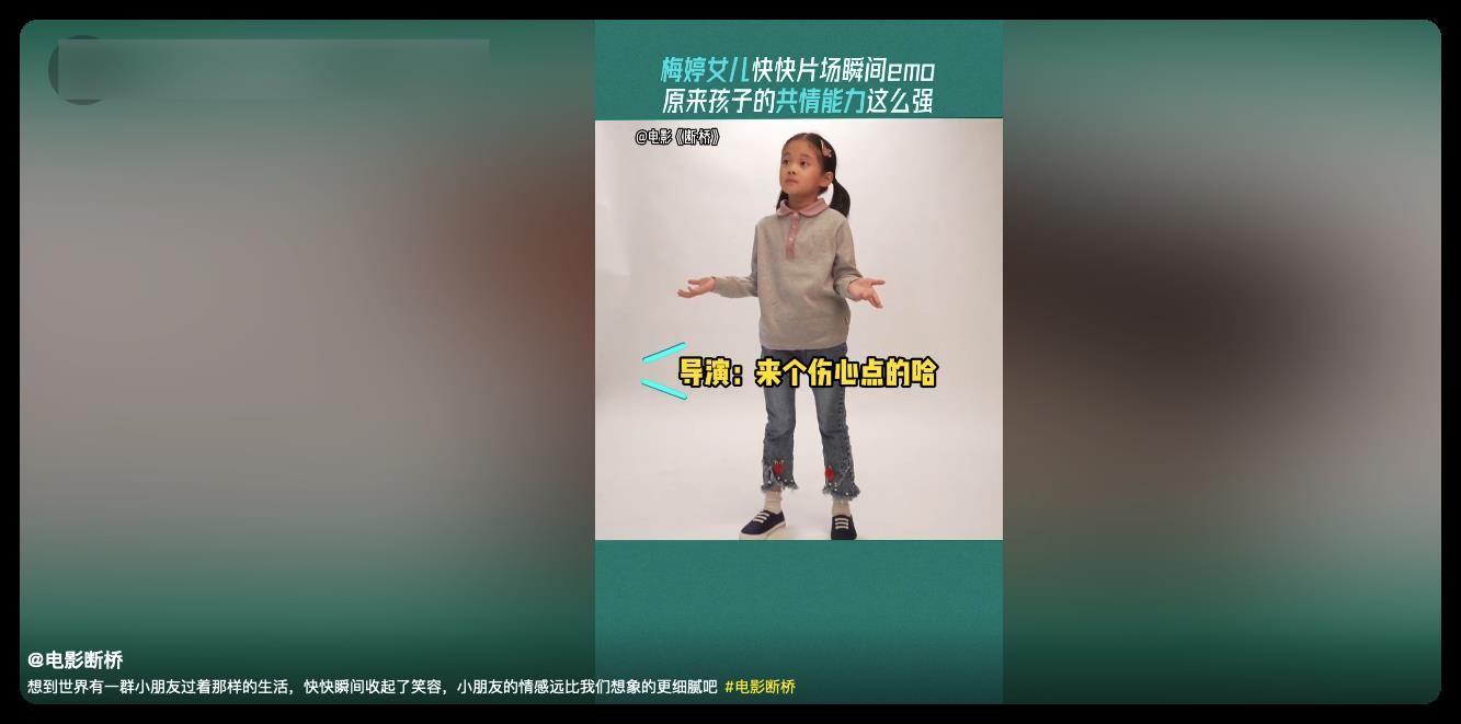 8月22日,《断桥》官博晒出梅婷女儿的拍摄花絮,她对着镜头说哭就哭,具有超强的感染力。