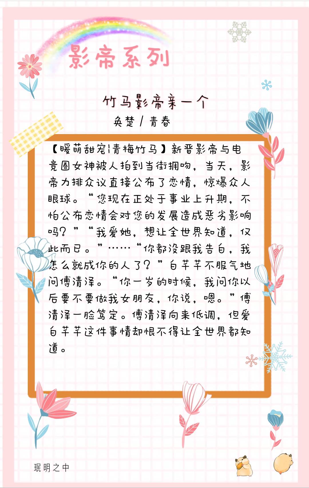 推荐理由:一岁见他,霸占领地,三岁见他,霸占他心。从小撩到大,也不知啥时候能撩到手!终于有一天,影帝再也控制不住自己了落入了小魔女的手中!看点就在于两个神一样的人物,女生的电竞,值得期待的一个情景安排,甜蜜的恋爱,没有那么多的白莲花,欣赏恋爱就好。