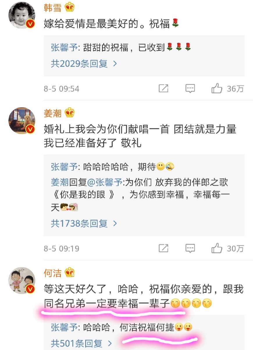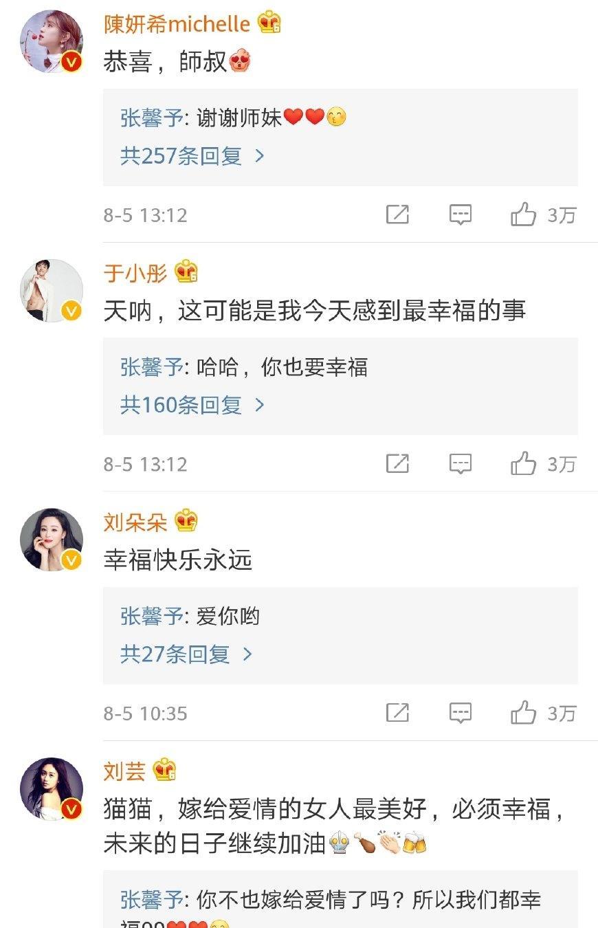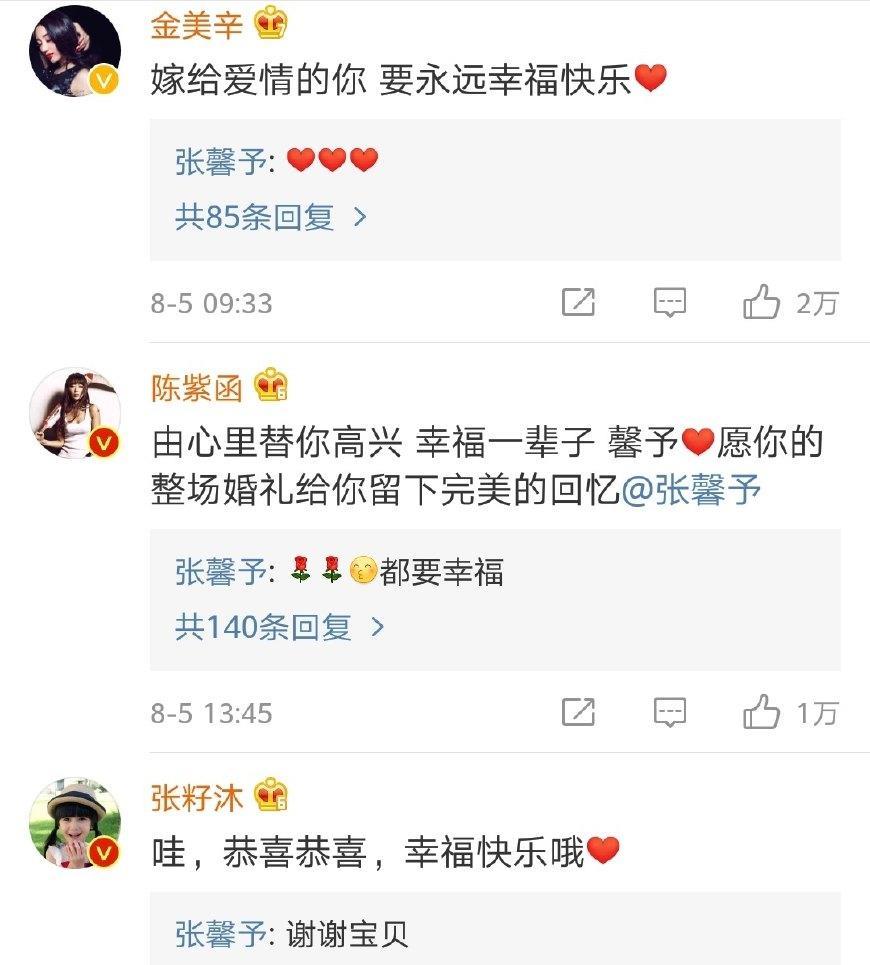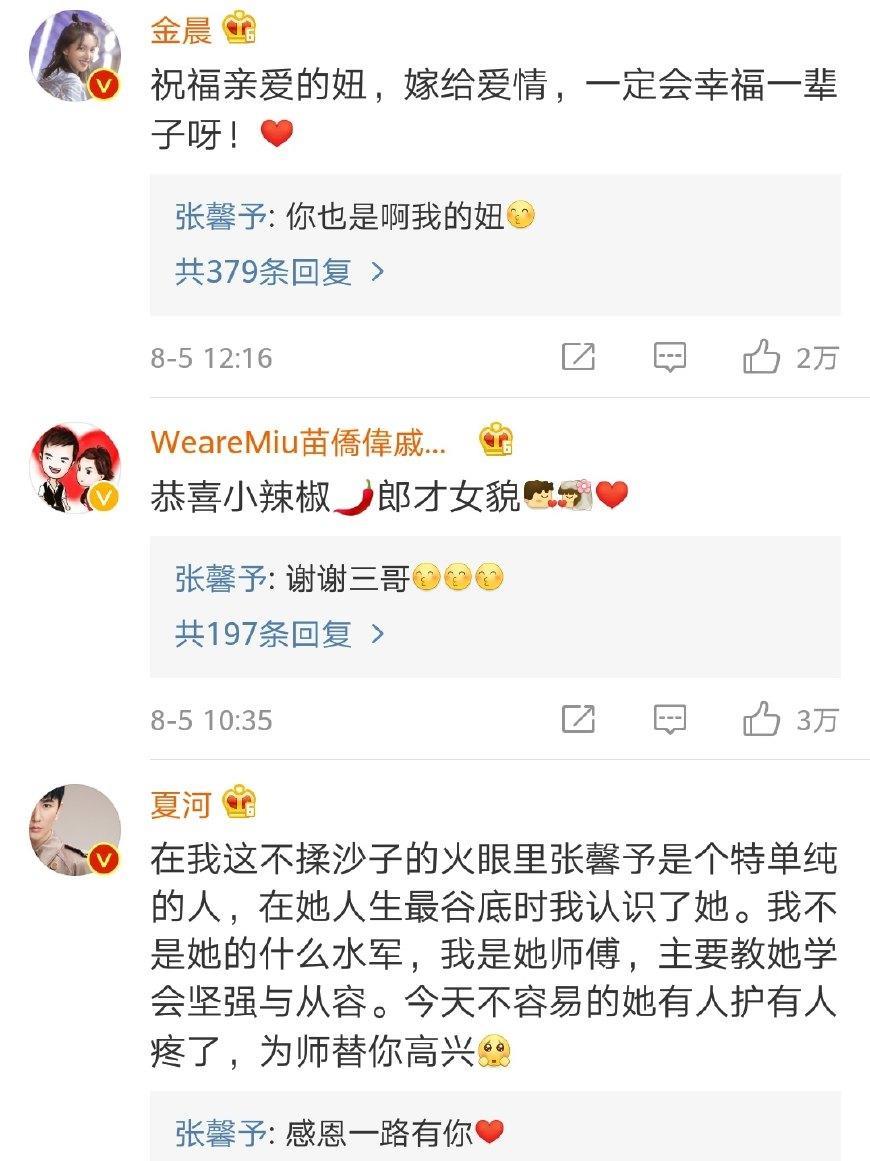 消息一出来,大半个娱乐圈的明星都纷纷转发祝福沾喜气,有张馨予圈内的好朋友、合作伙伴、导演、编剧等,包括韩雪、姜潮、金美辛、陈紫函、张嘉倪、何晟铭、金晨、苗侨伟、钟镇涛、陈妍希、于小彤……而且张馨予每个人的祝福都亲自回复致谢,礼数也非常周到。