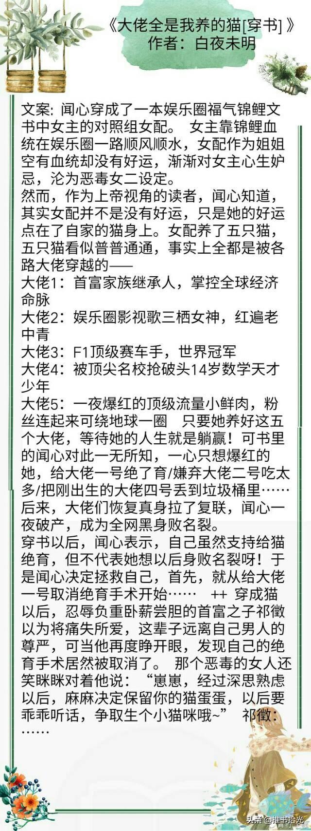 闻心穿成了一本娱乐圈锦鲤小说里同名同姓的恶毒女配,为了改变命运,闻心穿书后成为了一个兢兢业业的铲屎官,每天给大佬猫咪们做饭铲屎,获得了猫咪们的认可。最后,在猫咪大佬们帮助下,闻心的娱乐圈事业也开始蒸蒸日上,从一个名不见经传的18线女演员,变成了人尽皆知的实力派影后。 男女主的感情线从针锋相对到彼此依恋,水到渠成,配角猫咪们也都性格鲜明,结局美好