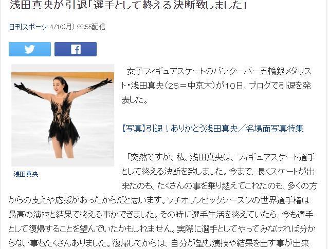 4月10日,浅田真央在自己的社交媒体上宣布退役,“这是一个突然的决定,作为一名花样滑冰运动员,我的使命已经完成。我能够滑这么久的时间,是来自于大家的拥护和支持,索契冬奥赛季拿到世锦赛冠军,本来是最好的退出时刻,但我坚持到了现在,已经不能再拿出令人满意的表现和结果,其实去年全日本锦标赛结束后,我就知道作为运动员已经无法继续下去,现在决定退役,我的花样滑冰生涯没有任何遗憾,我相信这是我生活的转折点,我会找到新的目标,我会继续往前走,感谢大家支持我到现在,非常感谢。”