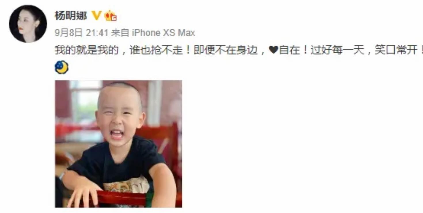 面对田亮的狂轰滥炸,杨明娜只是发了一条微博,贴出儿子的照片,表示:“我的就是我的,谁也抢不走”。
