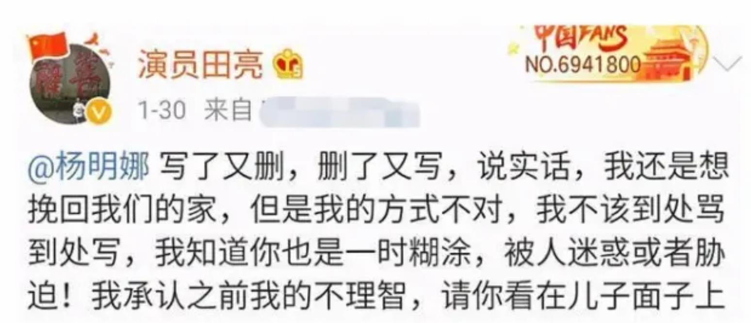 过了3个月,田亮又发了一条微博,直接喊话杨明娜,仿佛在向杨明娜道歉似的,说自己:“想挽回我们的家”,还说自己不该随便在社交平台上乱骂乱写,自己“不理智”,但他同时又说:“你也是一时糊涂”,让她看在儿子的面子上原谅他。