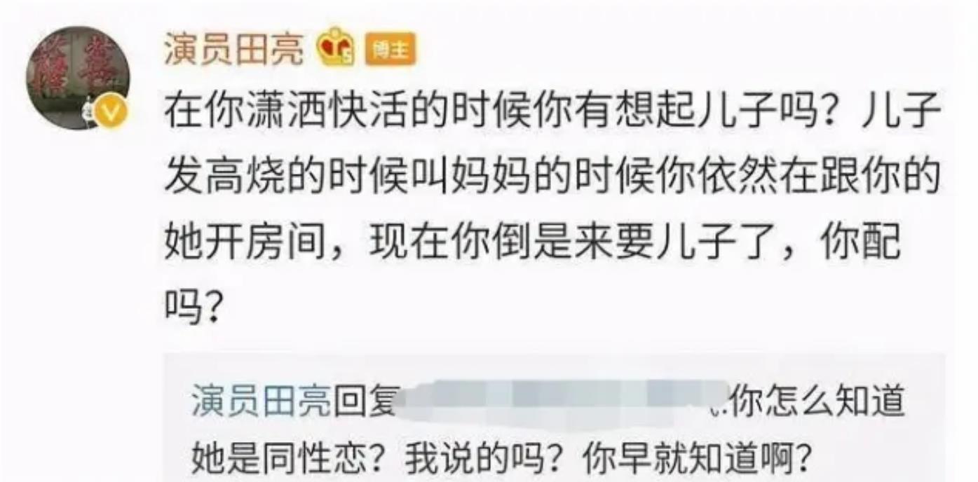 接着,田亮的另一条微博更是语出惊人,爆出杨明娜对儿子不管不顾,只顾跟别人“潇洒快活”,就连儿子发高烧时还在“跟你的她开房”,说她不配要儿子。