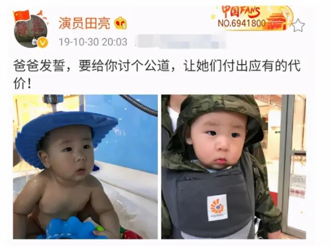 2019年10月30日晚上,田亮在微博上发了个帖子,说要发誓给儿子讨公道,让“她们”付出代价,还贴了两张儿子的照片。