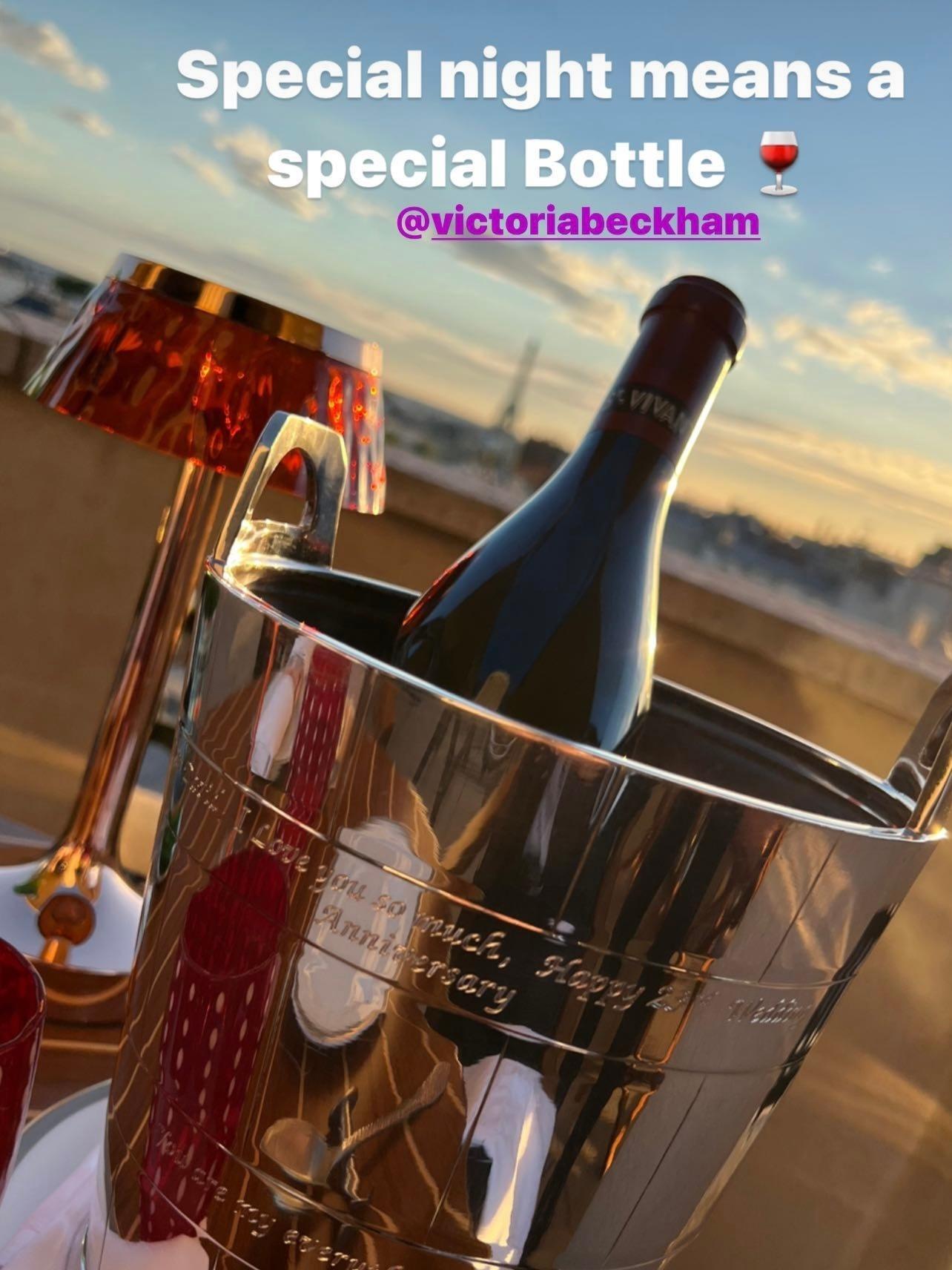 除了向天空放飞了一个红色的爱心气球外,在晒出的美酒的照片中,眼尖的粉丝发现,在放置美酒的铁桶上,维多利亚专门找人刻印了一排字:“大卫,我非常爱你。结婚23周年纪念日快乐。你是我的一切。” 在这个特别的浪漫之夜,美酒、美景、美人,小贝的心一定醉了。