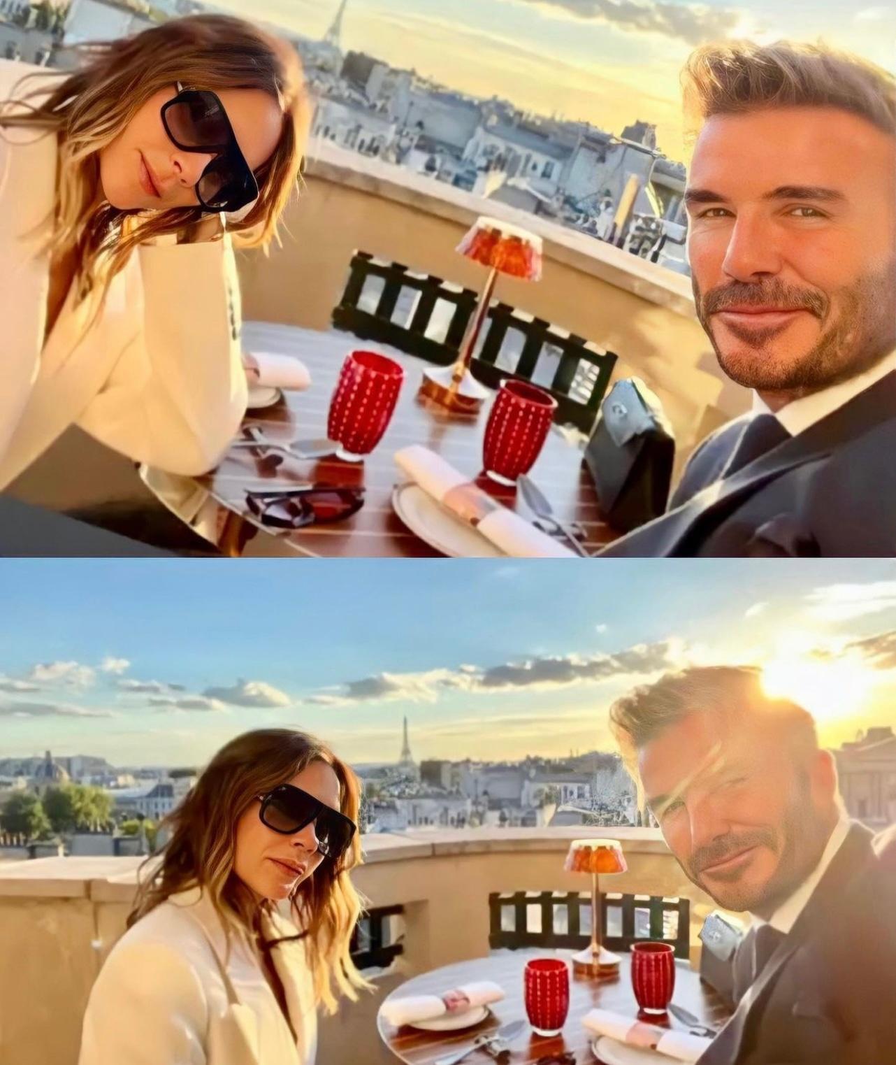 除了昂贵的美酒,夫妻俩在可以俯瞰埃菲尔铁塔的酒店顶层的露台上享受了一顿浪漫的烛光晚餐。维多利亚身穿白色双排扣Oversize西装搭配银光色丝袜,性·感又迷人,小鸟依人般依偎在大卫身边。维多利亚在社交媒体上还专门记录了这个特别夜晚的浪漫点滴。
