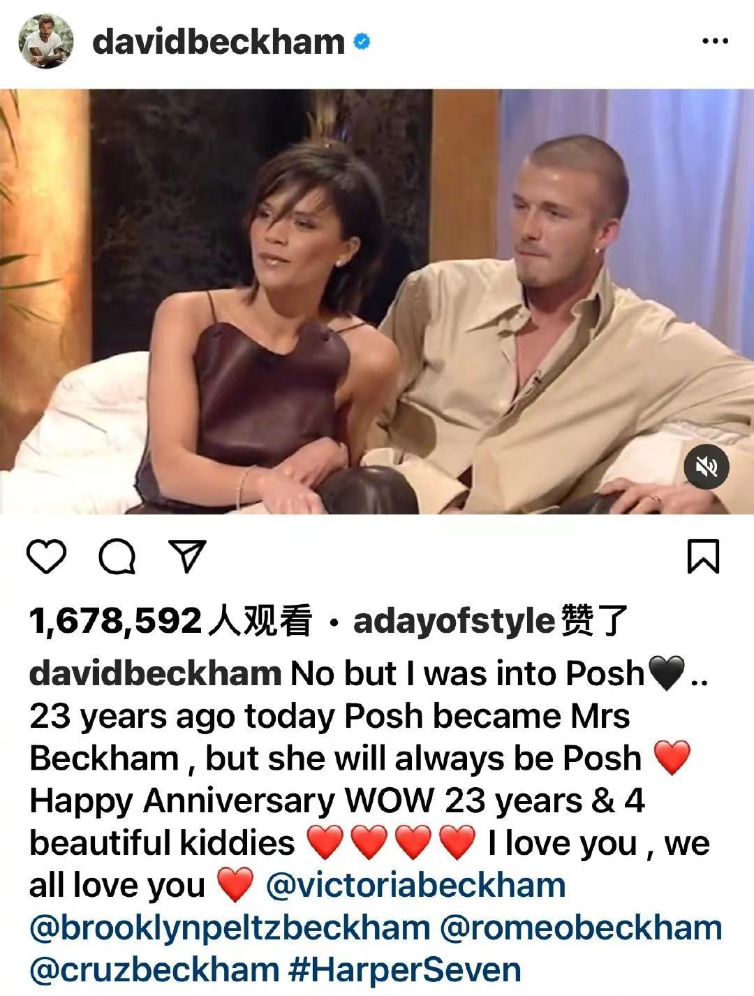 也是,世人都有两面(多面)。在不为外人知道的世界里,维多利亚一定有她独特的魅力,否则也不会牢牢抓住了“万人迷”大卫的心。大卫庆祝结婚纪念日的发文深情、直白:“23年前的今天,Posh成了贝克汉姆太太,但她永远都是Posh,周年快乐!哇!!!23年了&4个漂亮的孩子,我爱你!我们都爱你!!!”