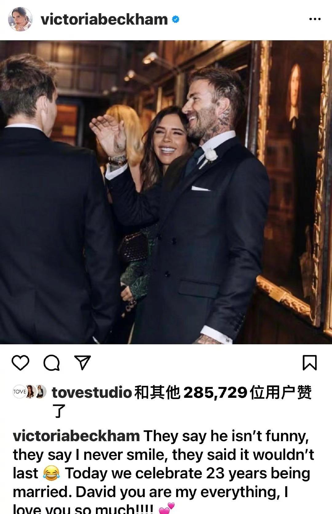 或许正是出于这样的原因,今年的结婚周年纪念日维多利亚有诸多感慨。7月4日,结婚周年的发文,四个孩子的老母亲说:“他们说他(大卫)不好笑,他们说我从来不微笑。他们说这段婚姻不会长久。(这里用的表情符号:笑哭)今天,我们庆祝23周年。大卫,你是我的全部,我非常爱你!!!”