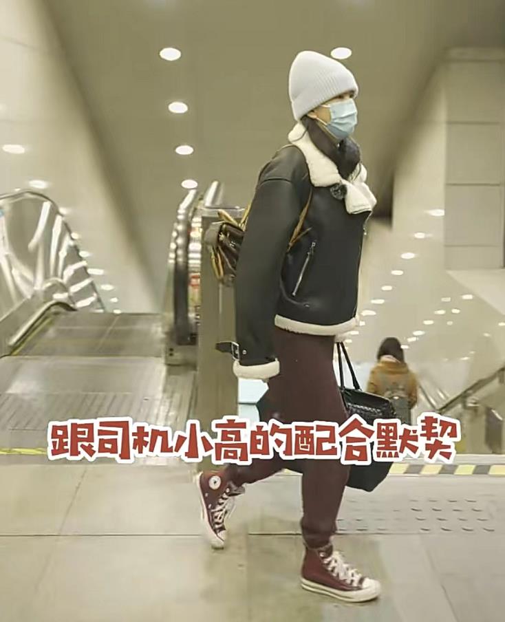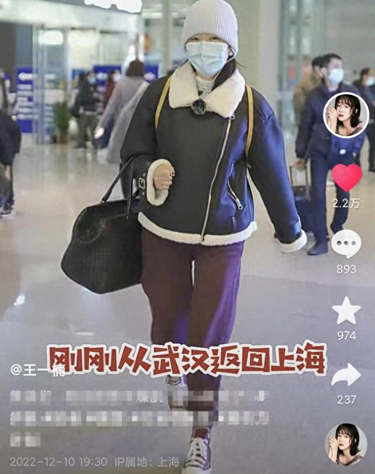 曝光的画面中,王一楠穿着黑色皮衣和休闲裤,头戴毛线帽子,打扮休闲。她背着背囊,手上还拎着行李,走路非常匆忙。