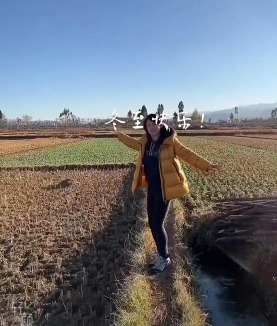 何政军的妻子范雨在田间奔跑,她的四肢纤细体态轻盈,边跑还边做出伸开手臂的姿势,可以看出心情特别的愉快。