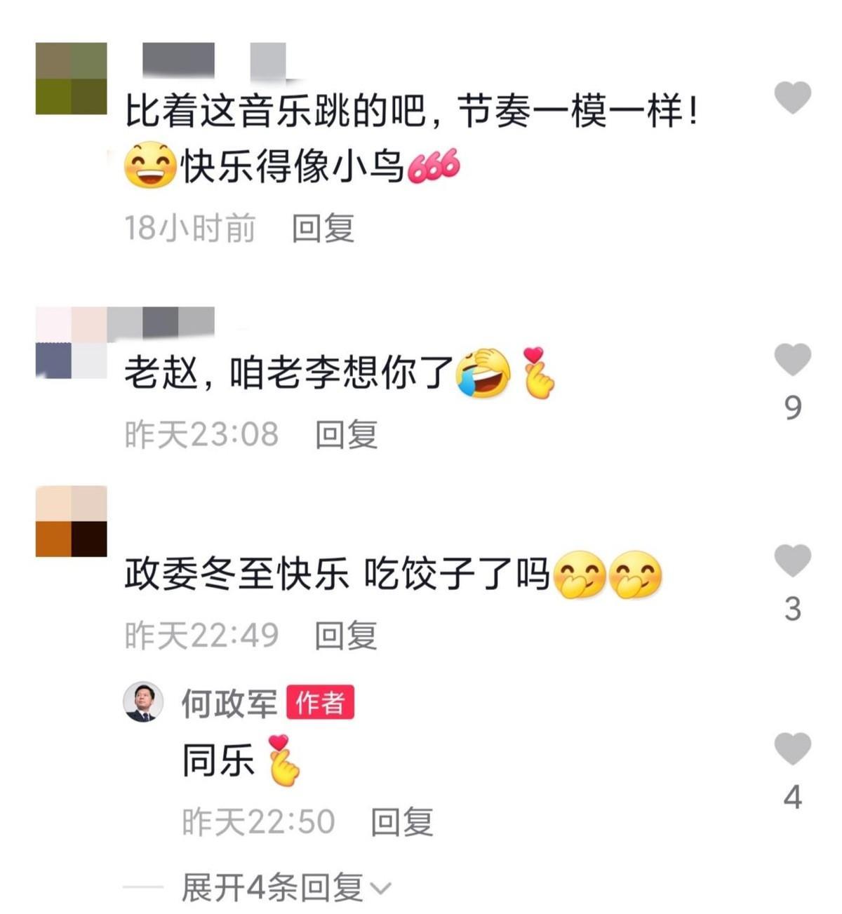 网友看了何政军晒出的动态,有人叫出他在《亮剑》中的角色名字,还是称呼他为政委,祝他冬至快乐。也有网友夸奖范雨快乐的就像小鸟,跳的很有节奏感。
