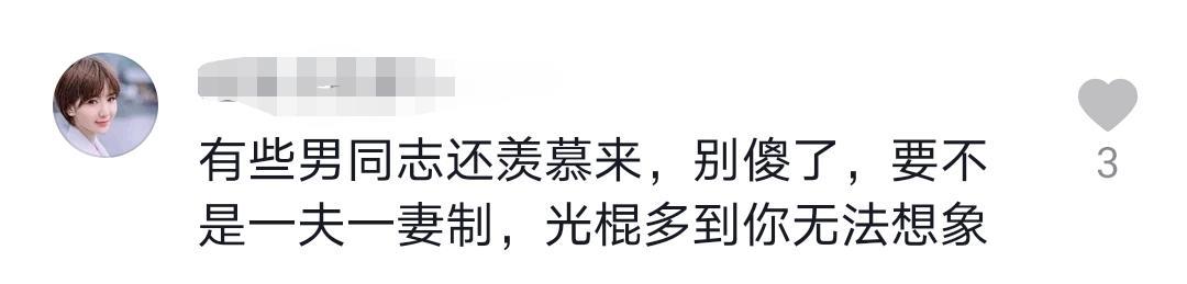 有些男同志还羡慕来,别傻了,要不是一夫一妻制,光棍多到你无法想象。