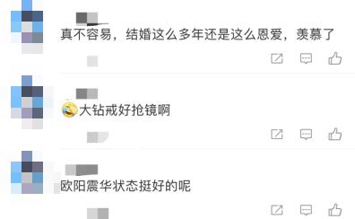 网友们在看到这组照片后,有人评论:“真不容易,结婚这么多年还是这么恩爱,羡慕了。”还有人称:“欧阳震华状态挺好的呢。”也有人表示:“大钻戒好抢镜啊。”