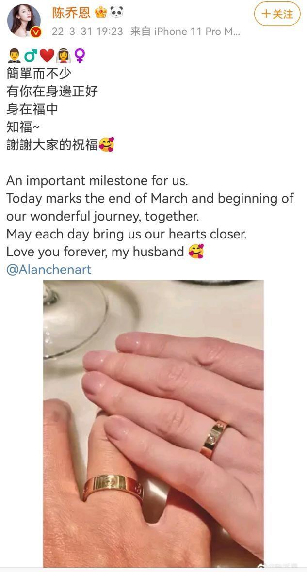 3月31日,台媒拍到陈乔恩和小她9岁的男友艾伦登记结婚,随后她的经纪人也表示消息属实,二人感情稳定,大家都很祝福。陈乔恩也开心地直呼:“我结婚咯”。