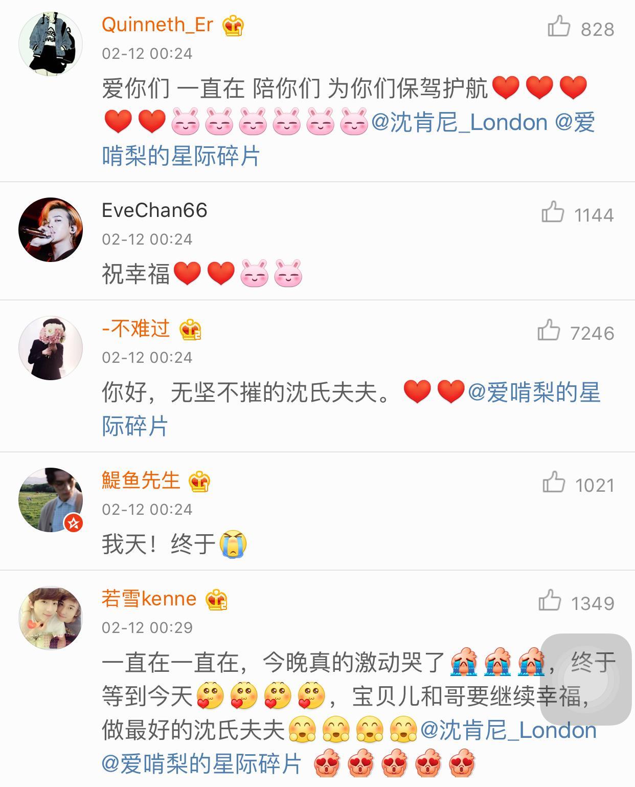沈煜伦在微博中写到:“就要成为真正的沈氏夫夫了!今天已经哭了一早上,消息是早上小兔和我说的,终于等到这一刻,我们要结婚了!接下来我们会策划这场来之不易的婚礼,目前暂定婚礼会有国外和国内两场,会在你们中选一部分人观礼,其他信息会及时和你们说,你们会一直在吗?” 接下来看看网友的评论:大部分网友表示支持、祝福