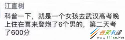 这个是一个在朋友圈流传的一个事件,当然这个事件的真假不得而知,事情是这样的:就是一个女孩子去武汉考试,然后在晚上的时候住的是喜来登,然后这个女孩子和6个男的在一个房间,这里具体的事情就不多说了,然后在第二天考试得了600分。虽然有人爆料但是具体的事件还不能确定,这个时间是在武汉电音节之后爆出来的。