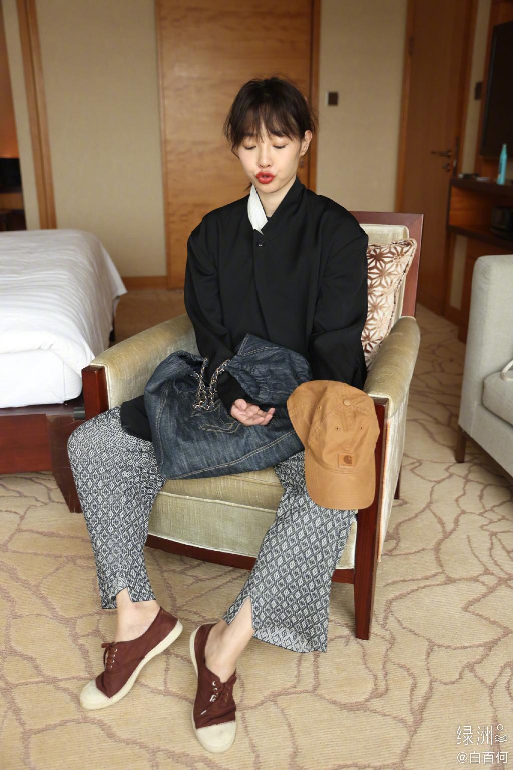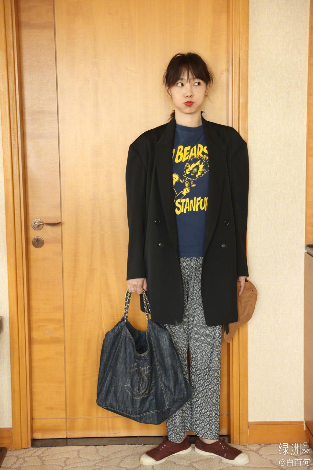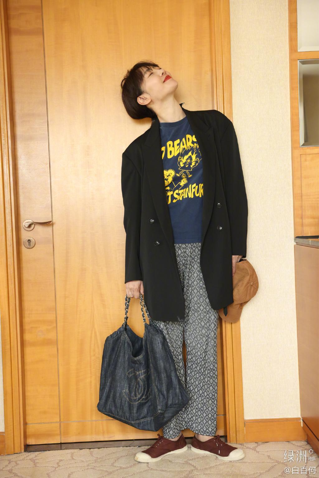 白百何晒出下班衣装,用男士西装搭配奶奶裤秀时尚巧思