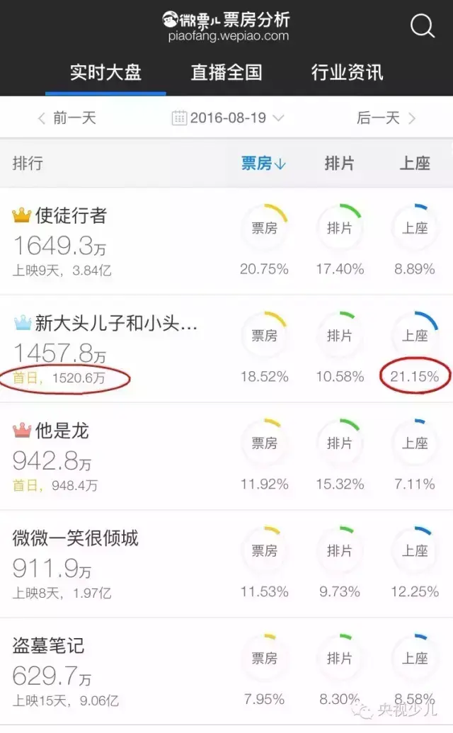 由央视动画有限公司倾情打造的动画大电影《新大头儿子和小头爸爸2一日成才》(简称“新大头”大电影2)今日登陆全国各大院线啦,到今天下午18:00,票房已经超过1500万元,而且上座率第一!