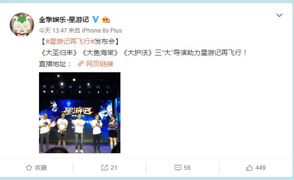 这次在飞行发布会还请到了《大圣归来》《大鱼海棠》还有即将上映的《大护法》等三“大”导演助力星游记在飞行。