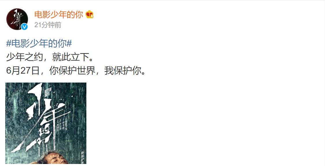 5月8日,《少年的你》官方微博宣布定档,将在6月27日全国上映。随后导演曾国祥,主演周冬雨、易烊千玺等转发留言:“一言为定。”