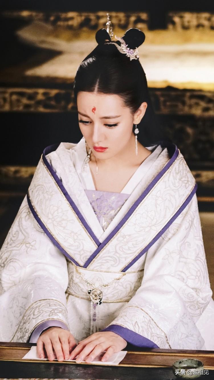 在凡间的贵妃妆扮风格华丽贵气 ,这身衣服整体白色,镶嵌高贵紫色边纹,肩部的设计非常有韵味。