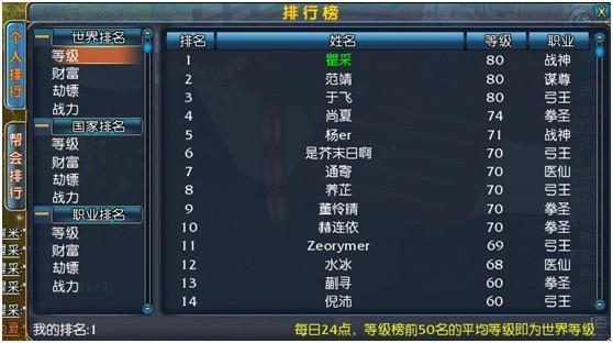 个人分类主要有等级、财富、劫镖和财力,并且分别显示世界排名,国家排名和职业排名。