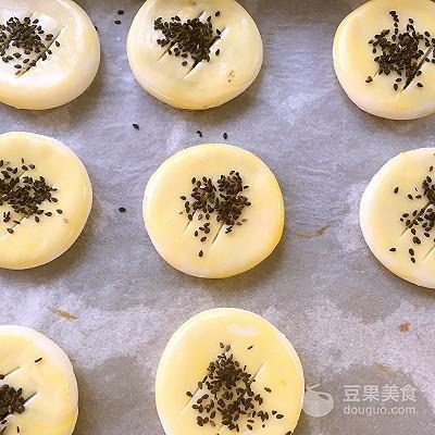12、蛋黄打散,在老婆饼表层均匀的刷上一层蛋黄液,之后撒上适量的黑芝麻