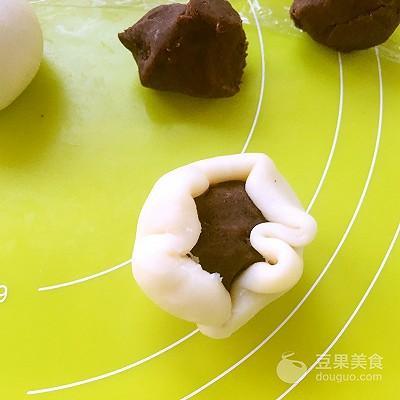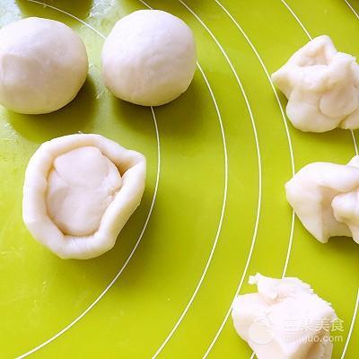 9、包裹上豆沙馅,用虎口一点点向上推面团,收好收口
