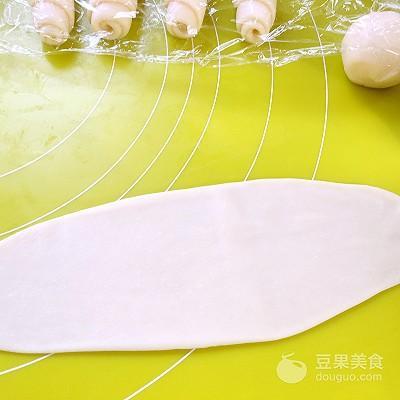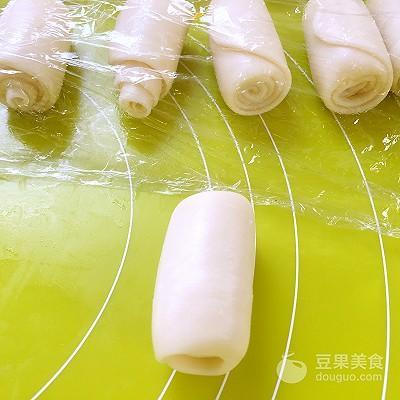 5、将松弛好的面团擀成长条,卷起来,盖保鲜膜松弛15分钟