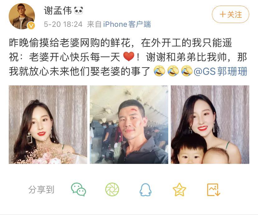 20日,"嘎子哥"谢孟伟在自己的个人社交平台晒出一家四口的隔空合照,520甜蜜表白老婆。还在配文中写道"昨晚偷摸给老婆网购的鲜花,在外开工的我只能遥祝:老婆开心快乐每一天!谢谢和弟弟比我帅,那我就放心未来他们娶老婆的事了"。还在最后艾特老婆郭珊珊,强势给网友秀了一波恩爱,网友纷纷高呼好羡慕郭珊珊。