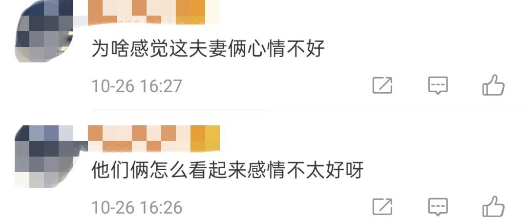 网友们也敏锐地捕捉到了他们俩之间的气场不太正常,纷纷发出了疑惑"他们俩是不是感情不太好呀""为啥感觉这夫妻俩心情不好"。